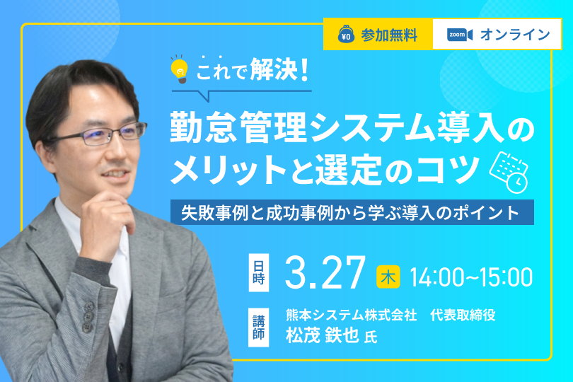 本セミナーでは、勤怠管理システム導入のメリットはもちろん、実際にあった失敗事例・成功事例を交えながら、導入のポイントを分かりやすく解説します。この機会にぜひご参加ください。